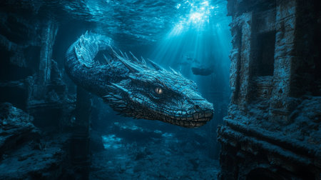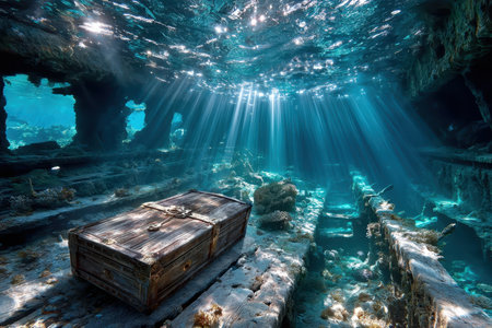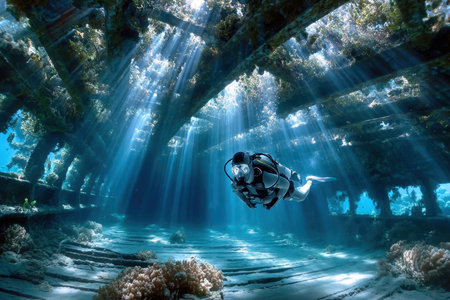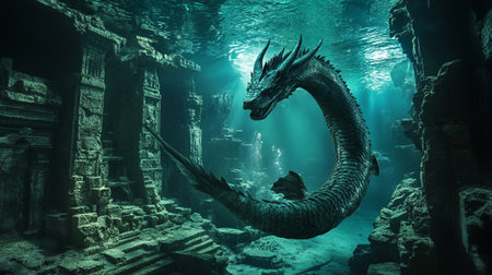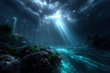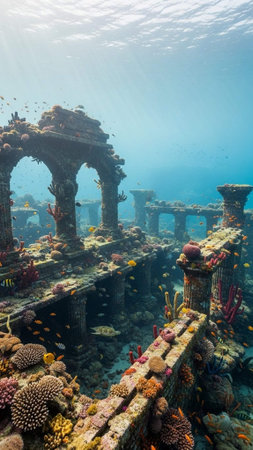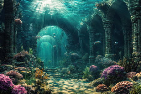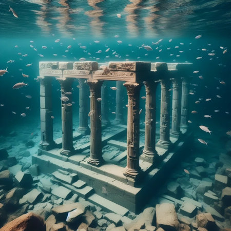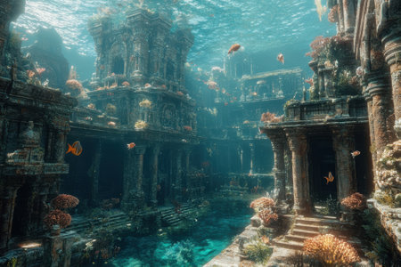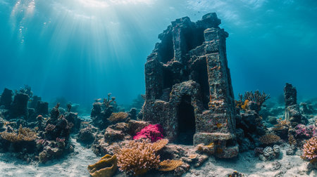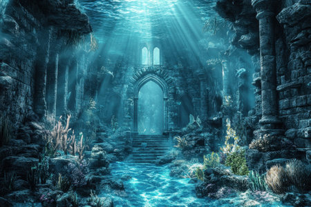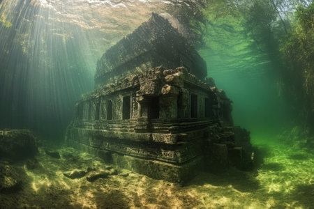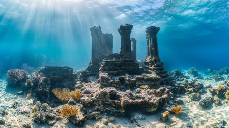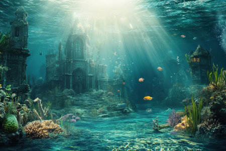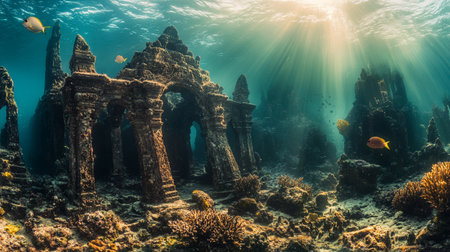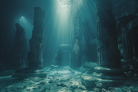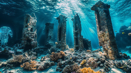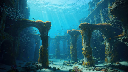 Mysterious underwater ruins of an ancient city illuminated by soft sunlight