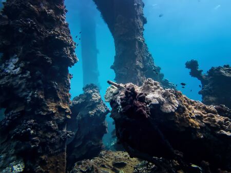 Underwater view of pier support from the bottom of the sea with growing corals.