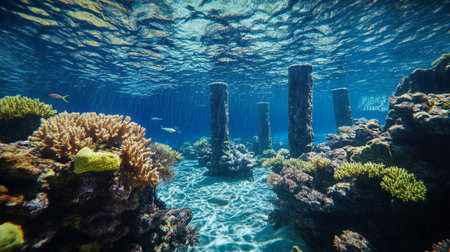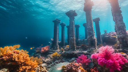 Colorful fish swim around ancient ruins, creating a magical underwater landscape with coral.
