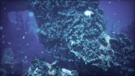 Underwater view of the ruins of an ancient shipwreck on a tropical coral reef