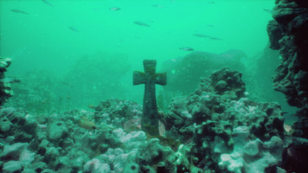 Diving into a serene underwater world reveals a weathered cross surrounded by colorful coral and schools of fish. Sunlight filters through, creating an enchanting atmosphere.