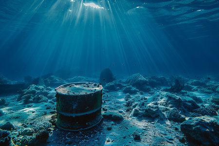 Underwater view of a rusty barrel on the sea bed with sun rays