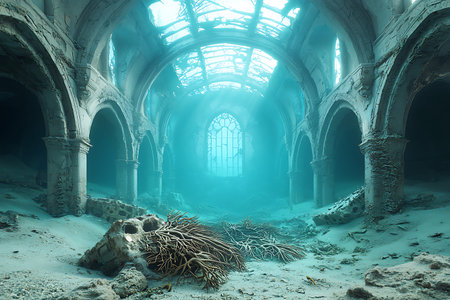 Explore an enchanting underwater scene featuring the remnants of a gothic cathedral, capturing the beauty and mystery of decay with vibrant coral.