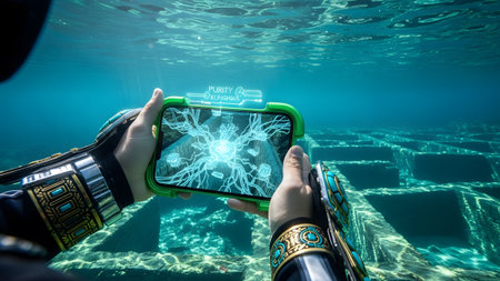 Holds showing underwater explorer holds tablet showing glowing blue structure in ancient ruins....