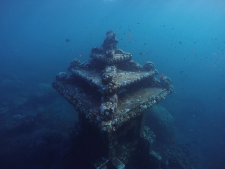 Underwater view of the ruins of an ancient temple on a coral reef