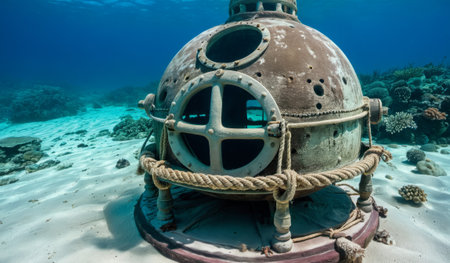 An old exploration vessel lies quietly on the ocean floor. Its weathered body is adorned with barnacles, and colorful coral surrounds it, creating a picturesque underwater scene.