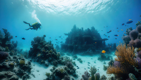 A diver explores a vibrant coral reef with a unique submerged structure while colorful fish swim nearby.