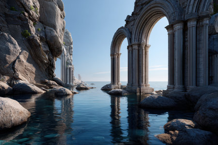 Ruins with grand arches stand next to calm waters, reflecting sunlight and surrounded by rocky cliffs.