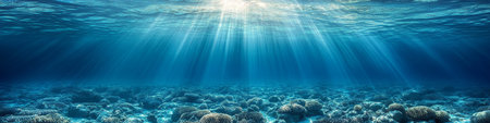 Sunbeams illuminate a tranquil, underwater scene with vibrant coral reefs. Deep ocean panorama.