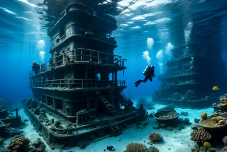 Scuba diver exploring a shipwreck in the deep blue sea surrounded by colorful fish, coral, and bubbles