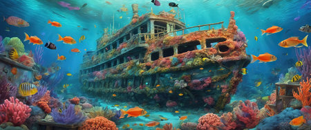 A shipwreck is shown in the ocean with fish swimming around it. Scene is one of mystery and adventure, as the shipwreck is a remnant of a past voyage