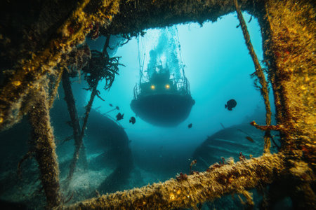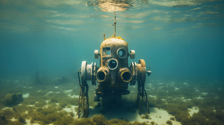 Exploring a sunken submarine with a remote-operated robot in deep ocean waters Generative AI