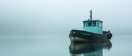 A small tugboat floats calmly in still waters shrouded in thick fog during early morning hours creating a serene atmosphere.