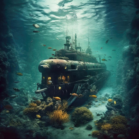 An AI generated illustration of an old and abandoned submarine in a deep water