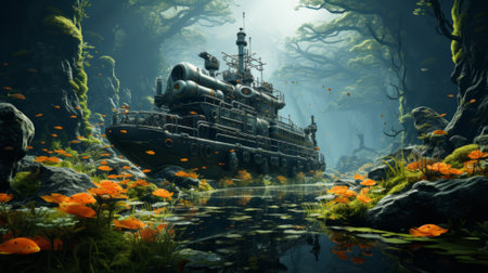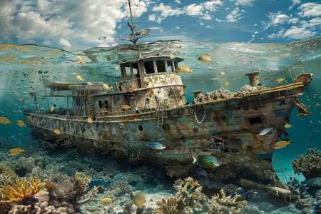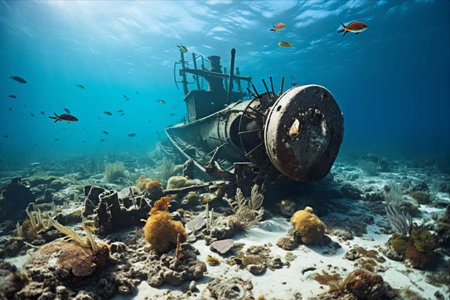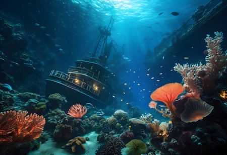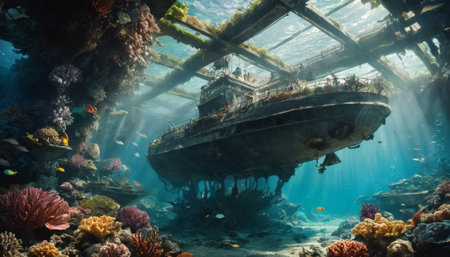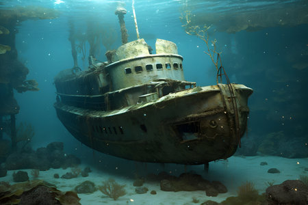 An old exploration vessel lies quietly on the ocean floor. Its weathered body is adorned with barnacles, and colorful coral surrounds it, creating a picturesque underwater scene.