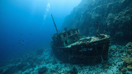A diver explores the eerie tranquility of a sunken shipwreck, its rusted contours submerged in the deep blue silence.