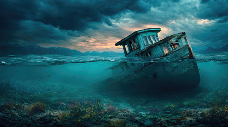 A weathered fishing vessel, partially submerged, is depicted amidst turbulent ocean waves under a dark, overcast sky. The image reveals both above and below the water, showcasing a dramatic composition. The color palette consists of blues, grays, and browns, with natural lighting. Suitable for illustrations and editorial projects.