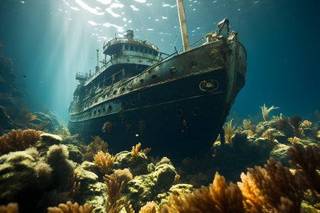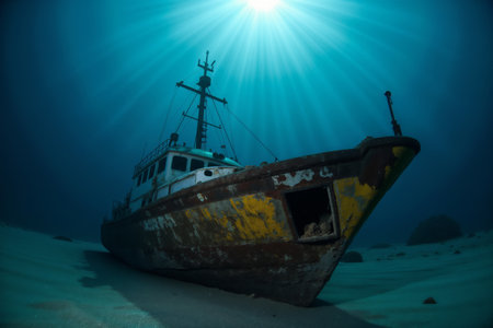 Sunken shipwreck underwater with light rays penetrating deep ocean water creating mysterious atmosphere
