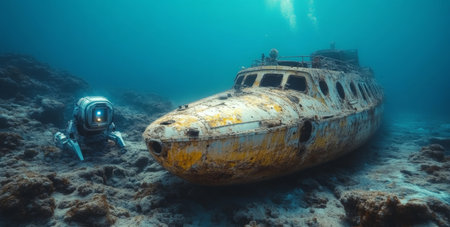Diving exploration robot investigates sunken submarine in ocean depths Generative AI