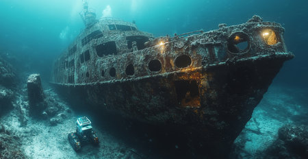 Exploring a sunken ship with a robotic submarine in deep ocean waters Generative AI