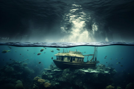 derelict fishing boat anchored to the ocean floor in murky water, created with generative ai