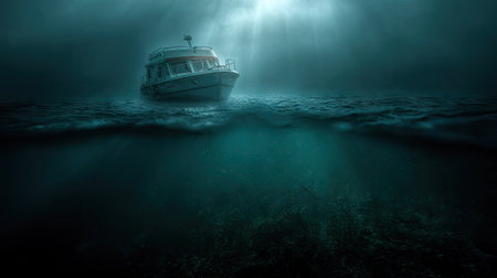 An image showcases a boat on the ocean surface with an underwater perspective. The scene is dominated by shades of blue and green, reflecting the aquatic environment. Strong overhead lighting penetrates the water, creating dramatic effects. The composition suggests a sense of mystery. Potential uses include editorial illustrations or conceptual projects.