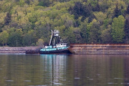 Tugboat, fishing boat (trawler) moored to a pier in a harbor. Cranes. Thick fog. Ventspils, Latvia, Baltic sea. Service, repair, freight transportation, logistics, industry, commerce