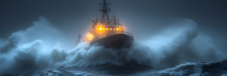 Generative AI Cargo ship in misty weather, fog surrounding the vessel, detailed and moody photorealistic scene