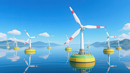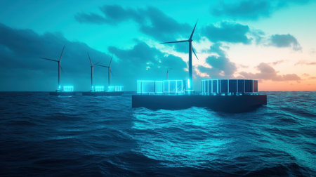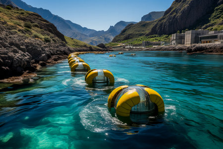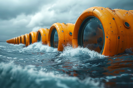 Innovative ocean energy converters harnessing wave power, suitable for renewable energy and engineering concepts. With Generative AI technology.