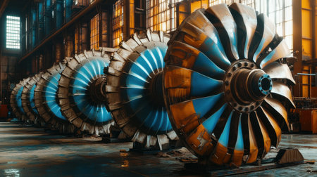 Rows of turbine engines in a well-lit industrial warehouse highlight the intricate design and engineering of aviation machinery components.