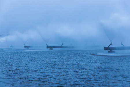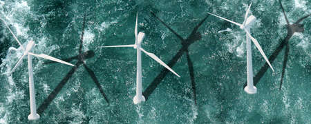 Wind turbines in a stormy sea. Turquoise water.