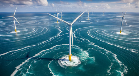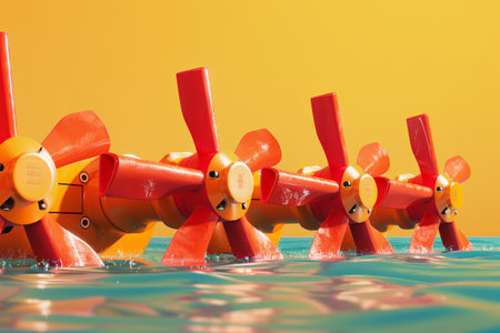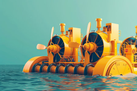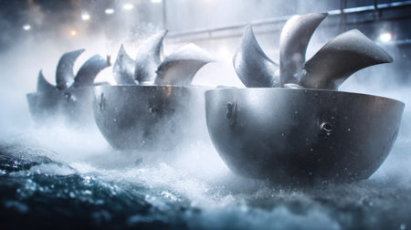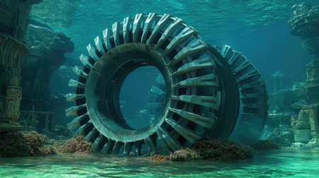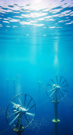 wide-angle shot of multiple submerged turbines, created with generative ai