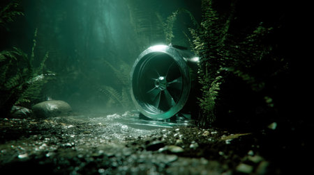 Mysterious underwater scene featuring metallic fan surrounded by lush green ferns and rocks, creating eerie yet captivating atmosphere. soft light enhances tranquil yet intriguing environment