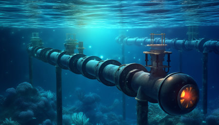 Underwater pipeline for oil and gas transport, subsea industry equipment at sea bottom, metal conduit in blue ocean, petroleum production and energy supply technology.