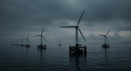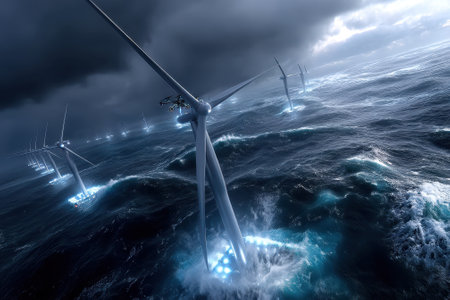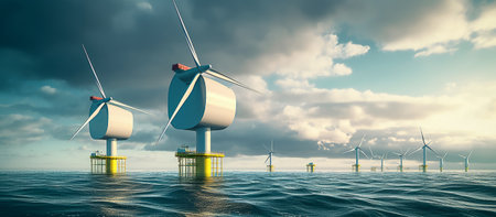 Waves gently sway as floating wind turbines stand tall against a dramatic sky.