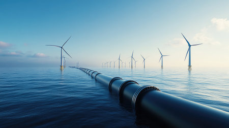 Offshore hydrogen pipelines and wind turbines working together, showcasing the synergy between renewable energy sources and sustainable infrastructure.