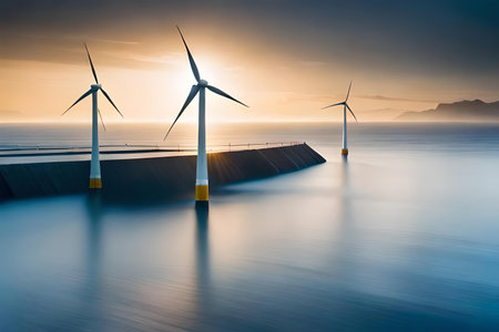 Stunning sunset over body of water, featuring wind turbines in distance. scene captures beauty of renewable energy, with vibrant colors reflecting off waves, creating serene and hopeful atmosphere