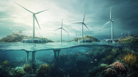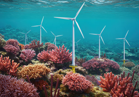 Underwater wind turbines are installed to generate renewable energy while supporting marine life. Colorful coral reefs and fish thrive among the structures, showcasing a sustainable future.
