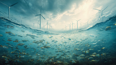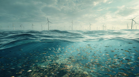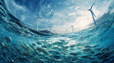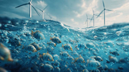 Beneath the surface, schools of fish swim gracefully near towering wind turbines, highlighting the harmony of marine life and renewable energy technology.