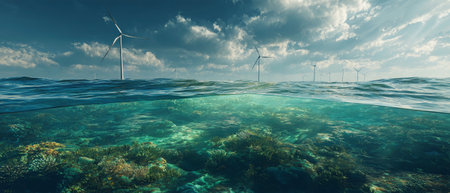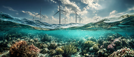 Colorful coral reefs flourish underwater, while sleek wind turbines rise above the waves, highlighting innovative green energy production in the open sea.