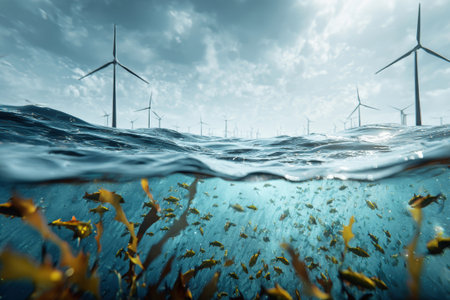 In a coastal landscape, schools of fish glide through kelp while wind turbines turn above, harmonizing nature and technology.