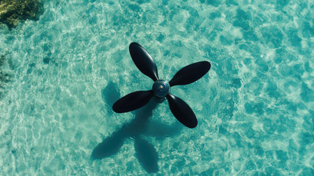 Minimalist composition of a boat propeller submerged in turquoise water casting subtle shadows