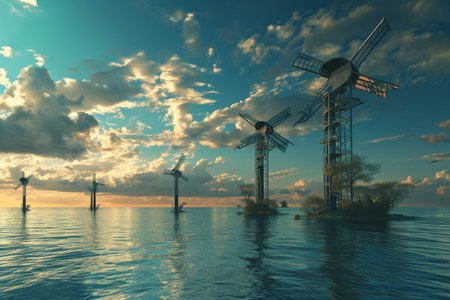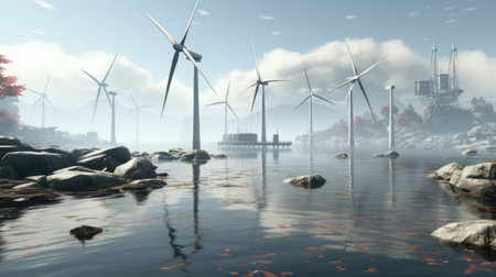 A group of wind turbines sitting on top of a lake. Generative AI image.