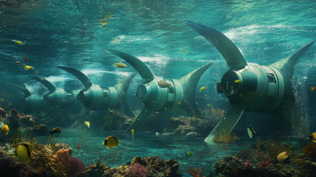 Underwater turbines are strategically placed within a lively coral reef. Schools of colorful fish swim among the turbines, highlighting the blend of technology and nature in energy generation.