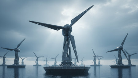 A floating wind farm with turbines that resemble giant flowers, harnessing wind and solar energy