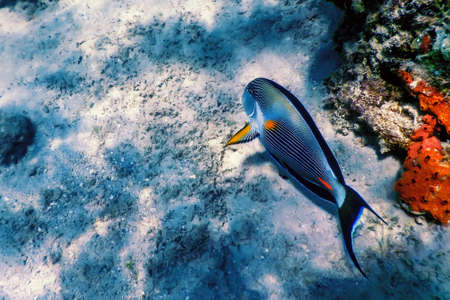 Coral and fish in the Red Sea. In front is Red Sea surgeonfish, in background deep blue sea with other coral fish. Safaga, Egypt.