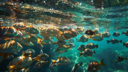 Fish gracefully swim in clear water, illuminated by sunlight reflecting off the surface in a serene underwater habitat.