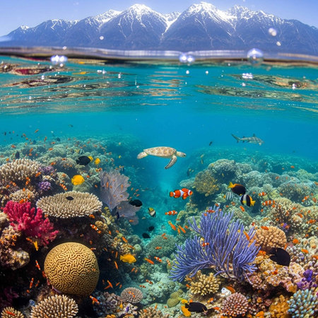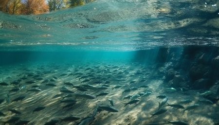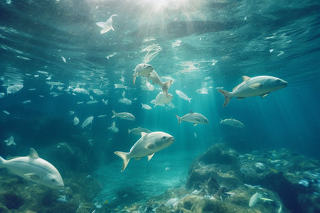 school of fish swim in clear blue waters, surrounded by lush vegetation and marine mammals, created with generative ai