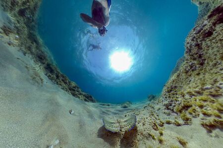 Stones bottom and reflection on surface underwater in ocean.