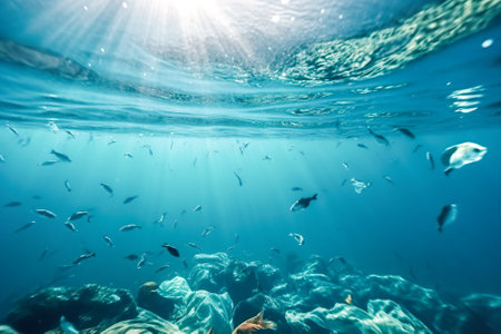 Clear blue ocean water with fish swimming, symbolizing the sustainability of marine life. Copy space.